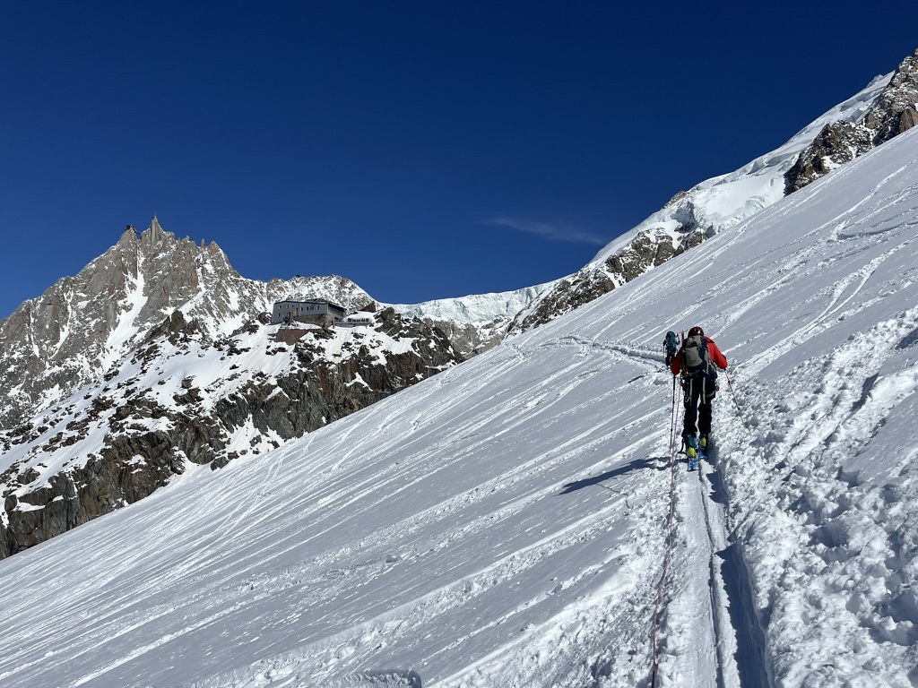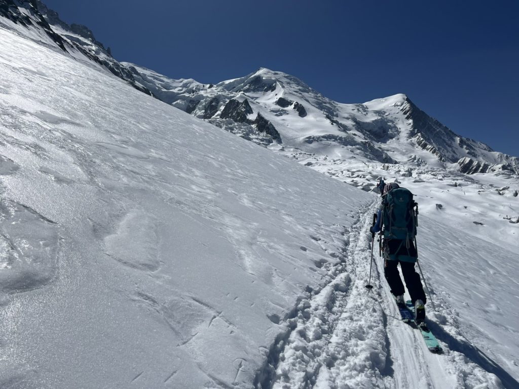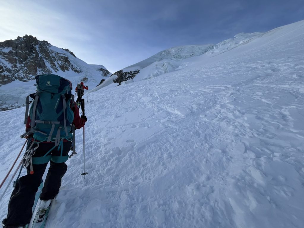 La première partie se fait sur un versant assez raide et la progression en est par conséquence assez efficace. Par ailleurs, nous n’aurons pas trop de distance pour rejoindre le Mont Blanc, les pentes sont assez marquées aujourd'hui.