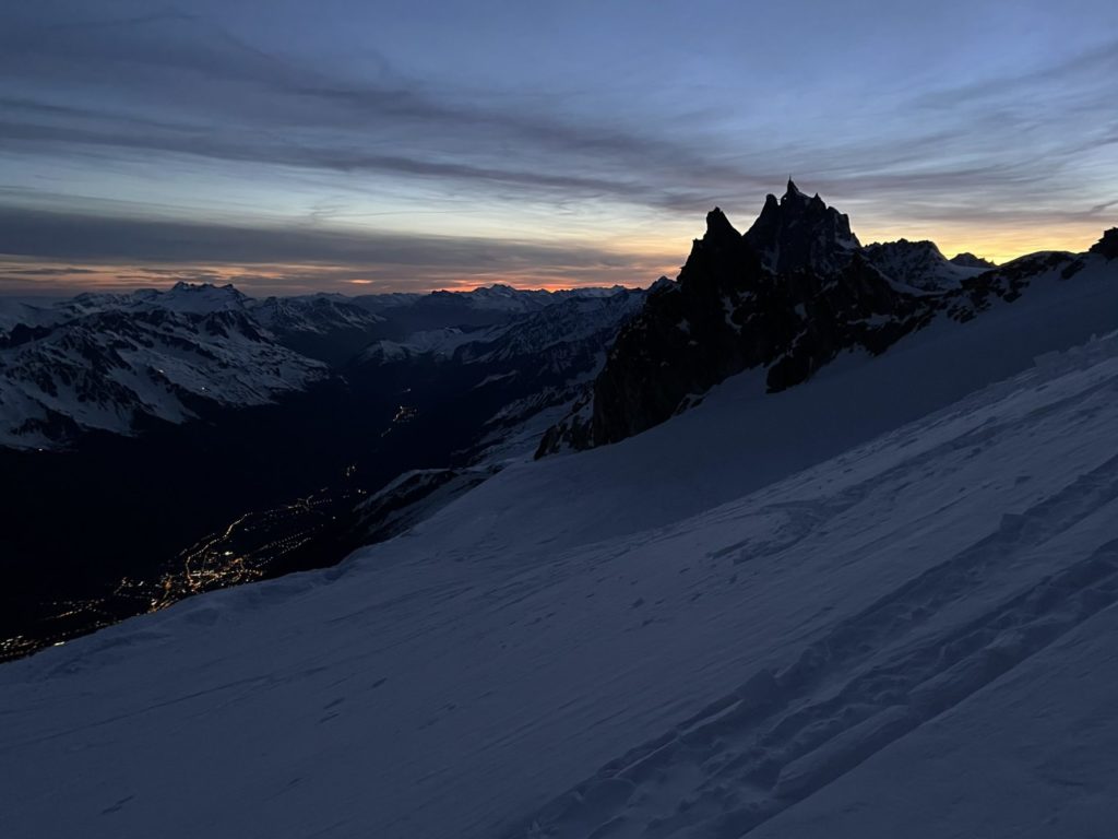 Les premières lueurs derrière l'Aiguille du Midi sont magnifiques.