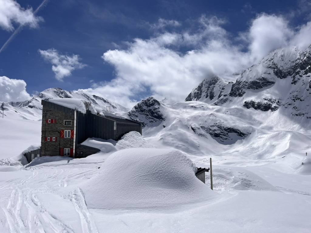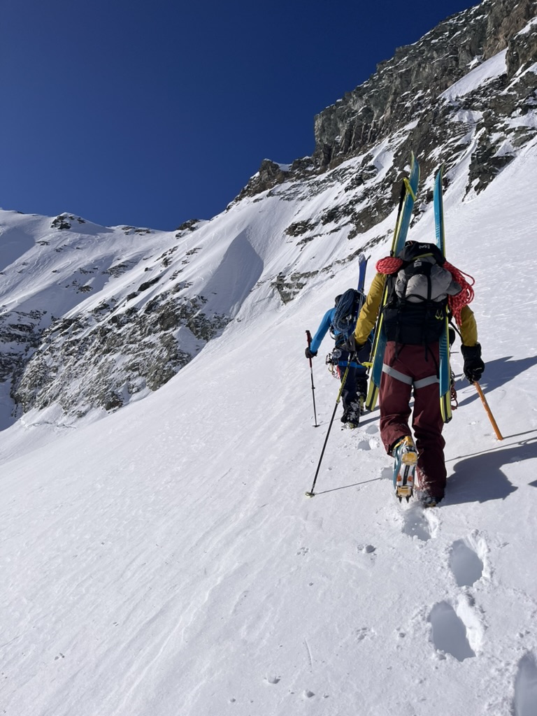 Heureusement, en perdant de l'altitude, la visibilité revient et la magie du ski de printemps opère enfin. La neige transformée nous offre de superbes courbes jusqu'au pied des pentes menant au refuge Gastaldi. Là, le contraste est saisissant. Bien que nous soyons sur un versant Nord, la chaleur devient écrasante. Nous crevons de chaud dans cette remontée finale, brassant une neige devenue profonde sous l'effet du rayonnement.