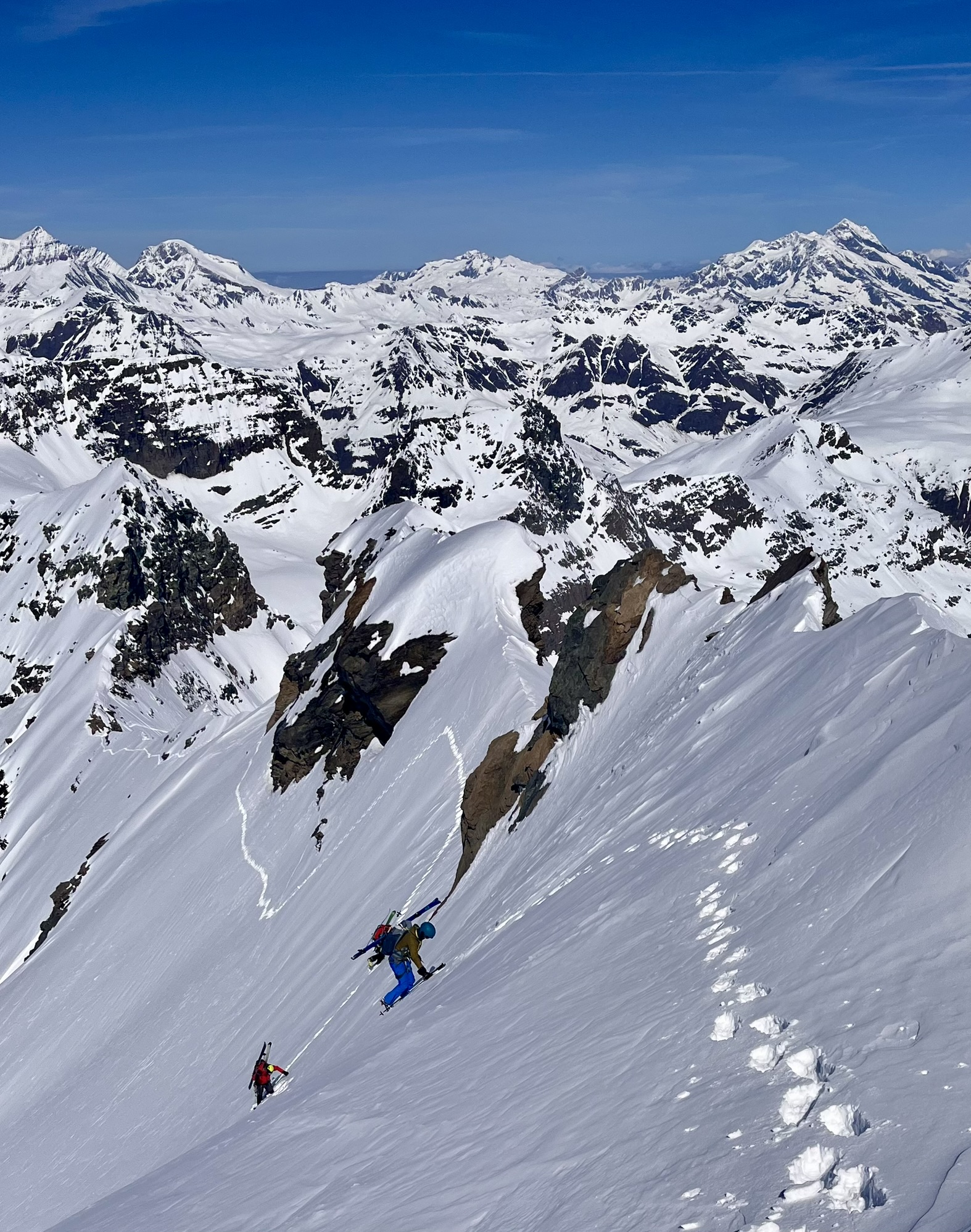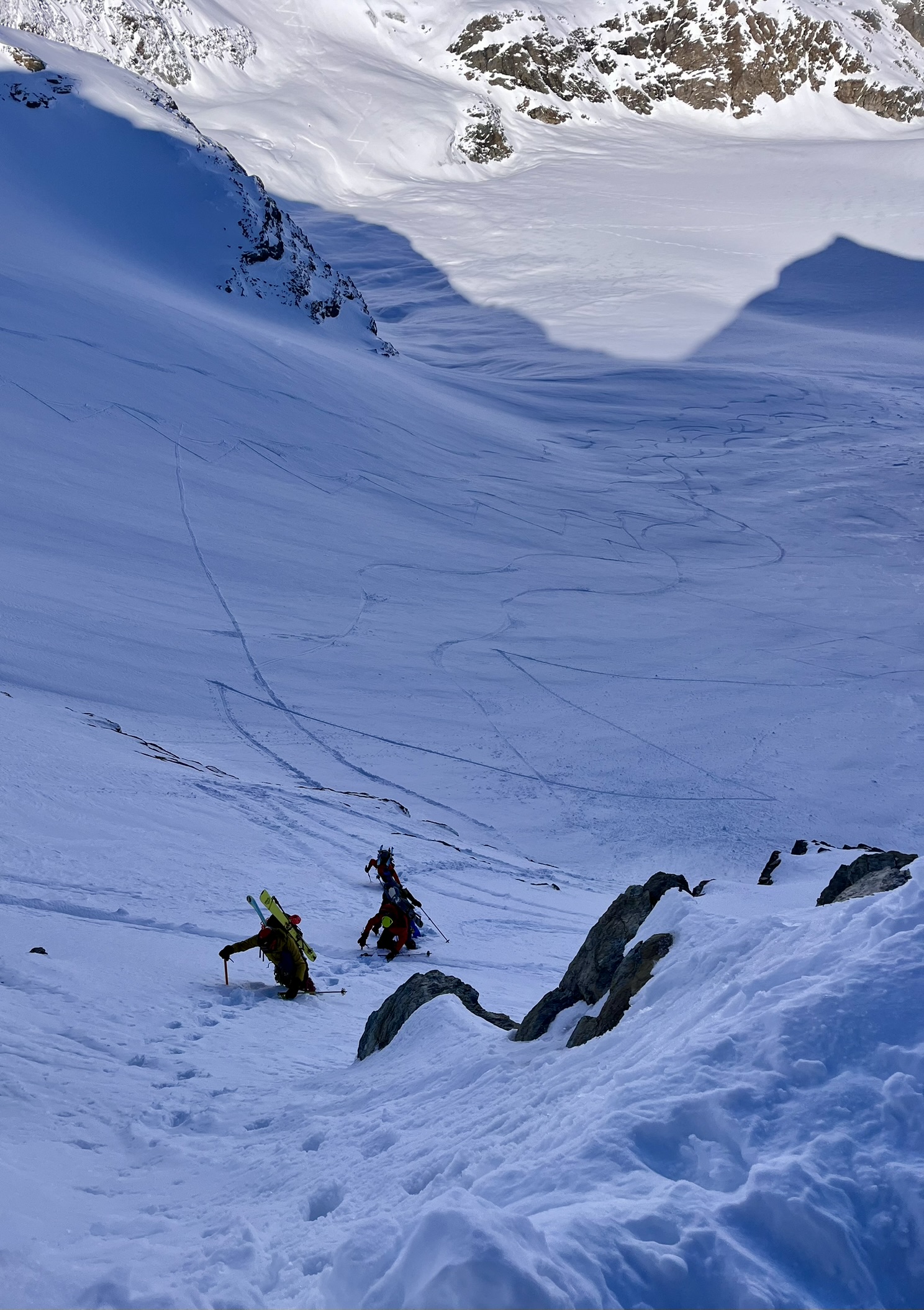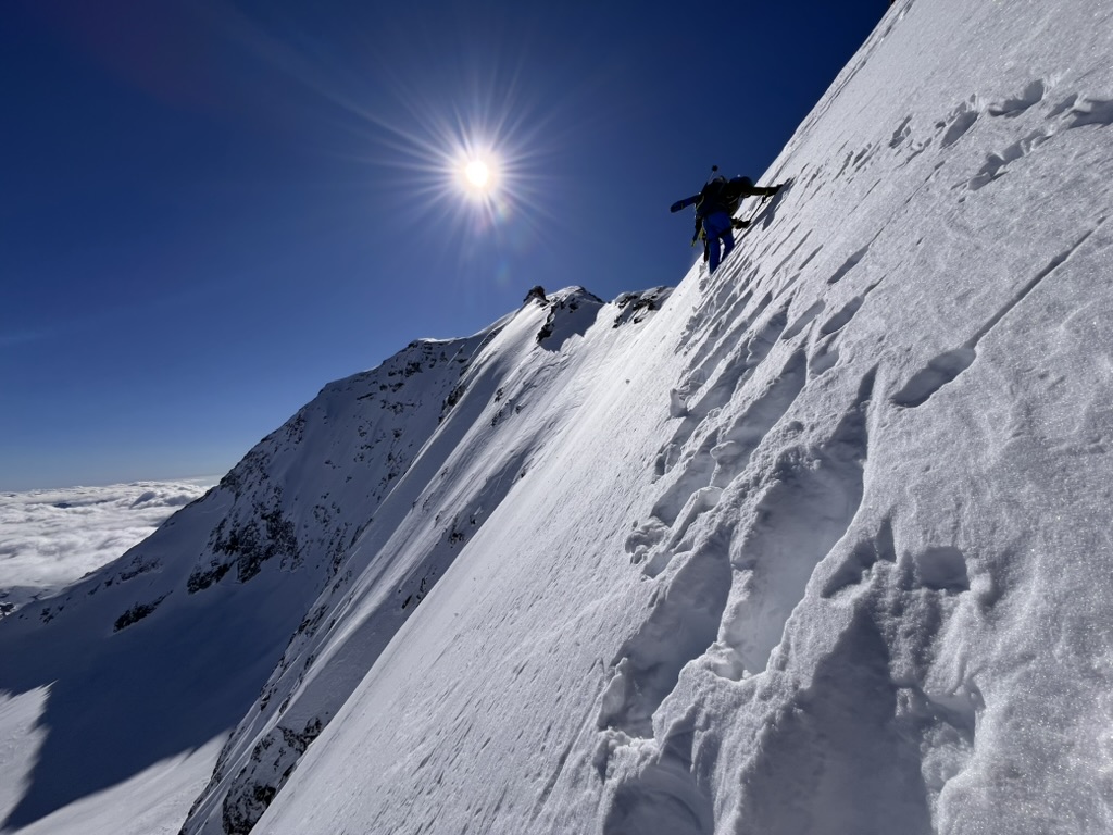 C'est ici que les choses sérieuses commencent. Les skis passent sur le sac, les crampons mordent la neige tendre en orientation Nord. Nous remontons un couloir soutenu pour prendre pied sur l’arête. L’ambiance change, c'est "plein gaz" désormais : à notre gauche, le versant Nord bien froid, à notre droite, les pentes ensoleillées plongeant vers l’Italie.